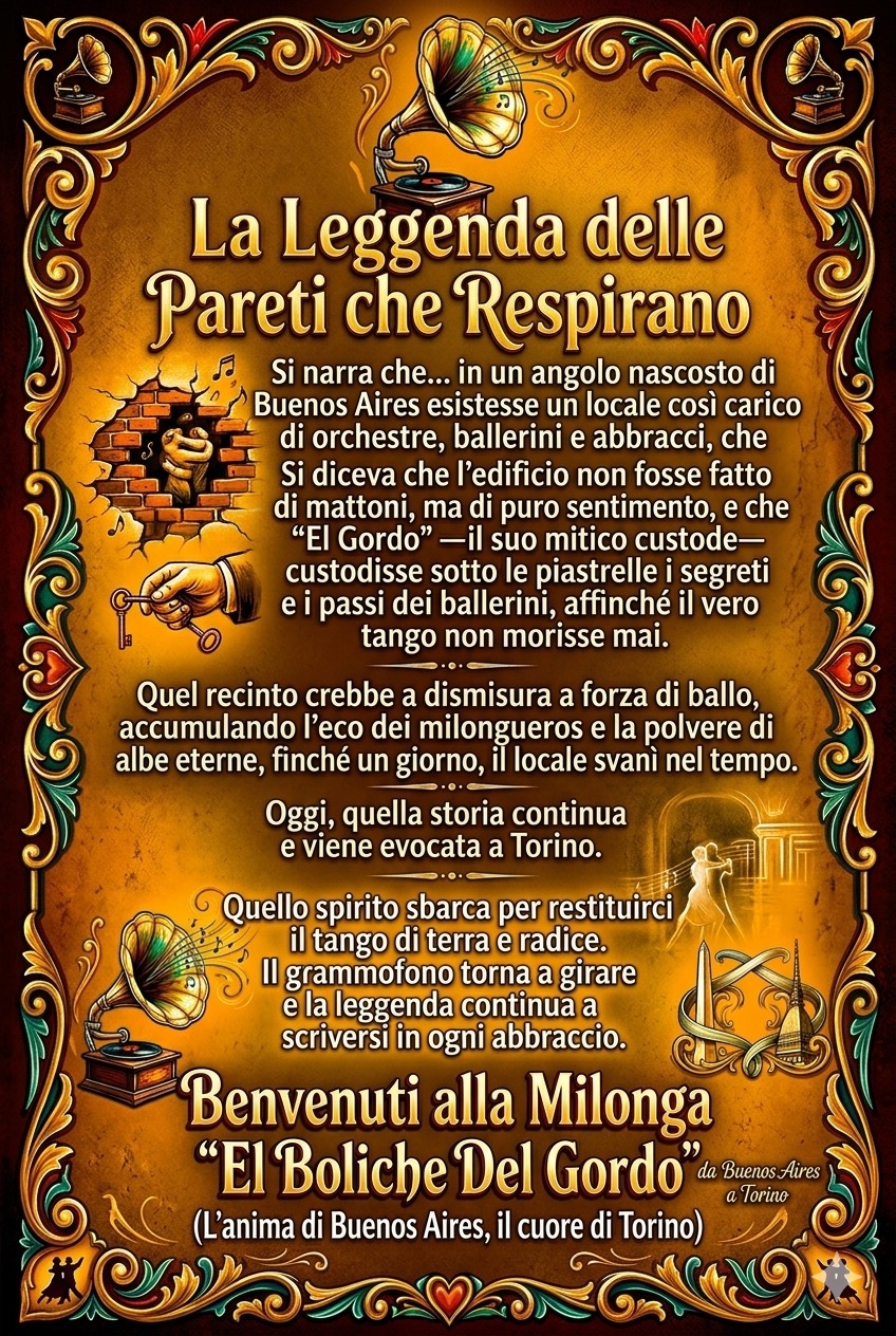 Si narra che… in un angolo nascosto di Buenos Aires esistesse un locale così carico di orchestre, ballerini e abbracci, che le sue pareti iniziarono ad espandersi. Si diceva che l’edificio non fosse fatto di mattoni, ma di puro sentimento, e che “El Gordo” —il suo mitico custode— custodisse sotto le piastrelle i segreti e i passi dei ballerini, affinché il vero tango non morisse mai.